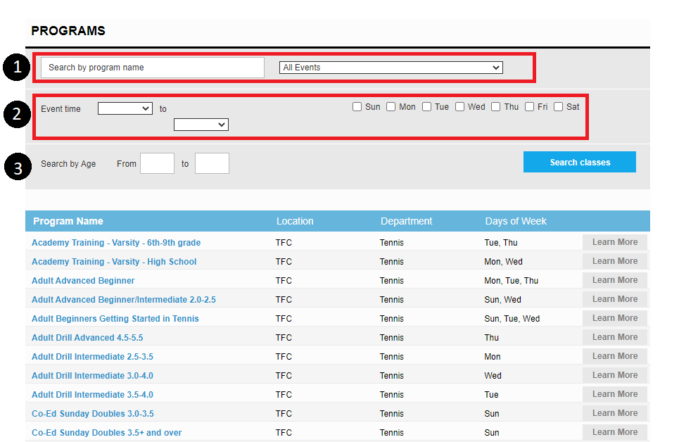 After selecting Search Classes, the results will display as a list. To register for a program, select the name of the program or the Learn More button.