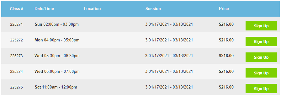 Once the program is selected, all available days/times for the program will be listed. Select the green Sign Up button to register for a given class.